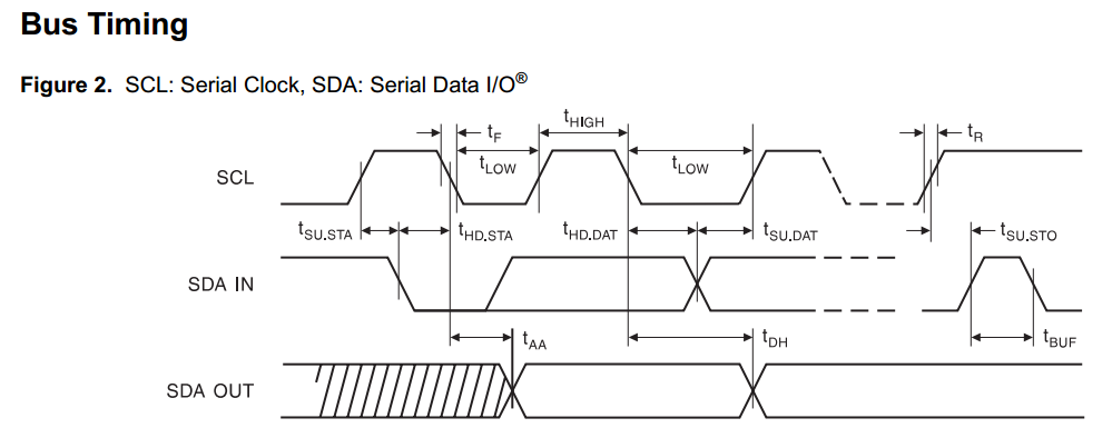 因此可以得出,AT24C02 的 I2C 数据传输速率应该是快速模式(400 Kbit/s)