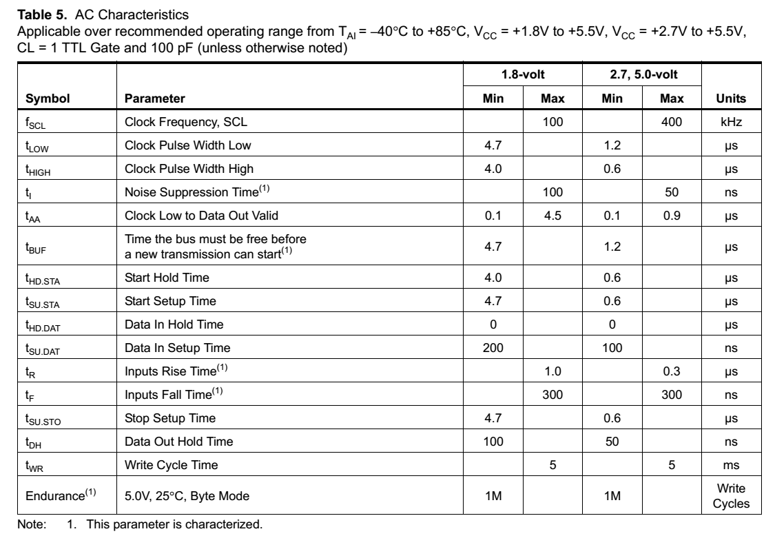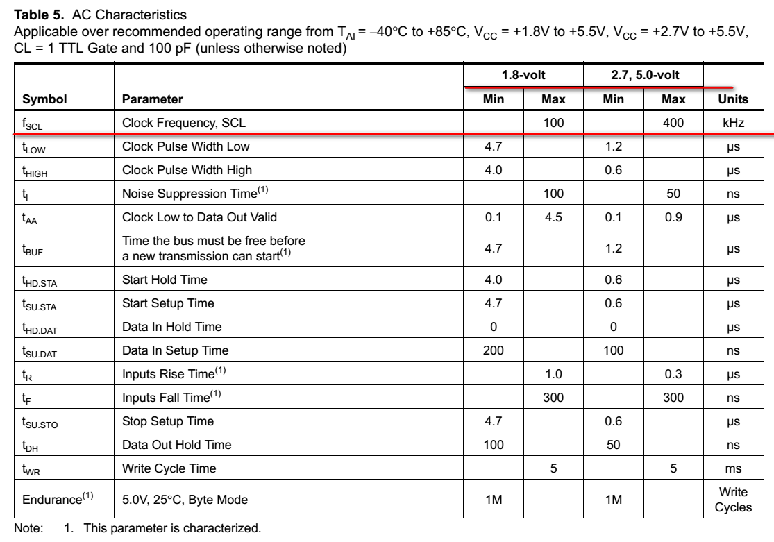 可以看出来,2.7V或5V时,SCL时钟频率最大值为 400KHz。