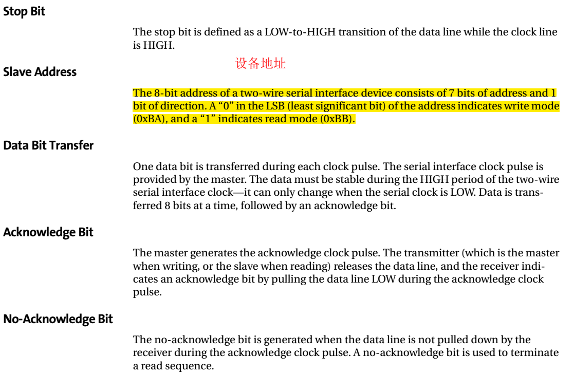 双线串行接口器件的8位地址由7位地址和1位方向组成。 地址的LSB(最低有效位)中的“0”表示写入模式(0xBA),“1”表示读取模式(0xBB)。