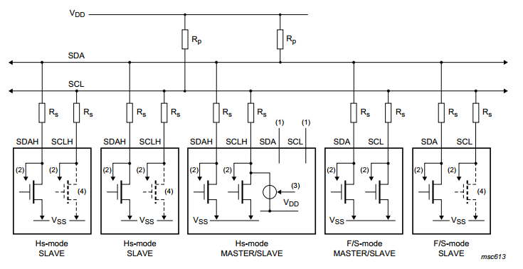 上图中除了一对提升电阻Rp之外,还有每个I2C设备依现况的需要可选择加装一对抗干扰用的电阻Rs(尤其是当SDA,SCL的布线绕经特殊干扰源时)。