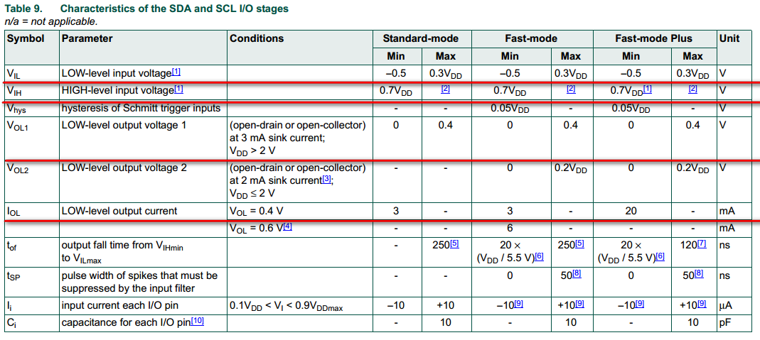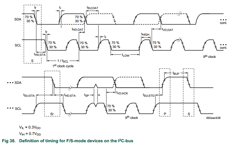 由于各种不同的技术设备(CMOS,NMOS,双极),可以连接到I2C总线,逻辑“0”(LOW)和“1”(HIGH)的电平不固定并取决于VDD的相关电平。输入参考电平设置为VDD的30%和70% VIL为 0.3VDD,VIH为 0.7VDD 一些传统器件的输入电平固定在VIL = 1.5 V和VIH = 3.0 V,但是所有新器件都需要这个30%/ 70%的规格。