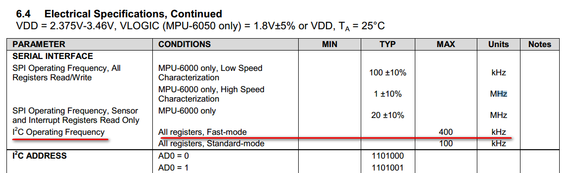 同上,得出 MPU6050 的 I2C 数据传输速率应该是快速模式(400 Kbit/s) 。