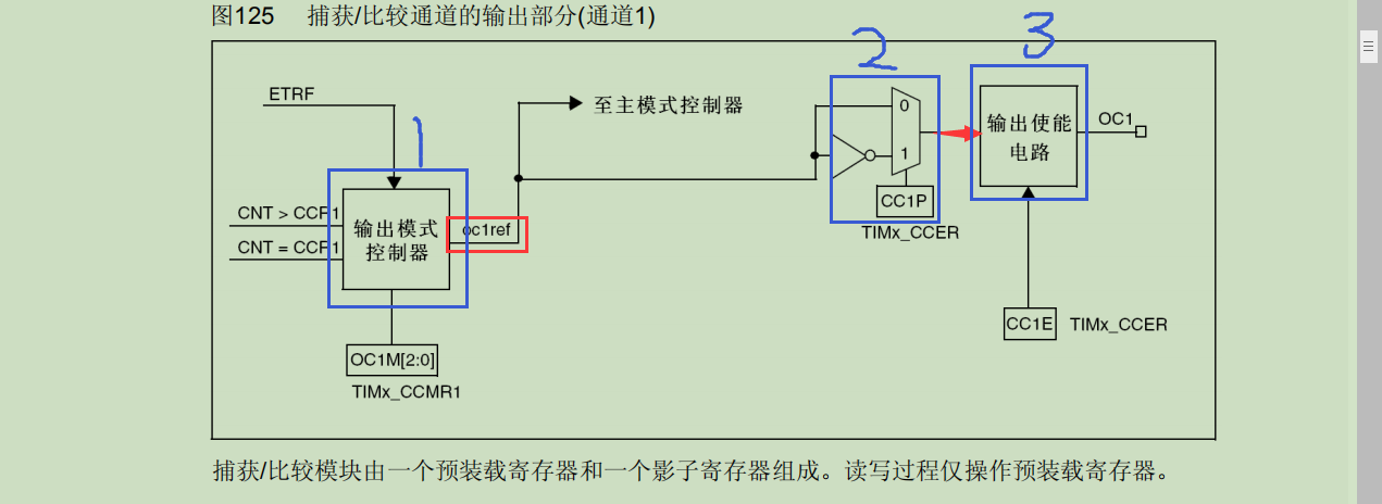 红色字体告诉我们:OCREF为无效电平时为低电平,OCREF为有效电平时就是高电平。
