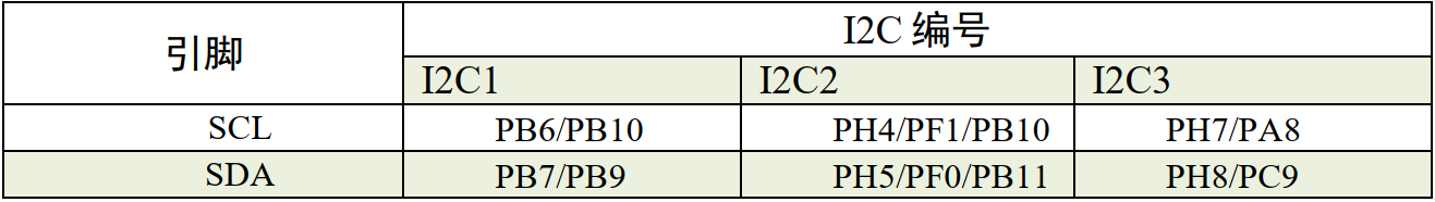 I2C 的所有硬件架构都是根据 SCL 线和 SDA 线展开的。 STM32 芯片有多个 I2C 外设,它们的 I2C 通讯信号引出到不同的 GPIO 引脚上,使用时必须配置到这些指定的引脚,见下表。关于GPIO 引脚的复用功能,可查阅《STM32F4xx 规格书》,以它为准。
