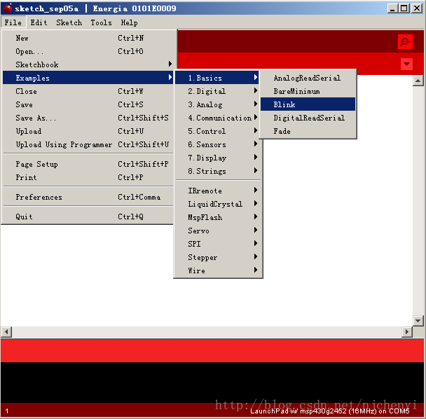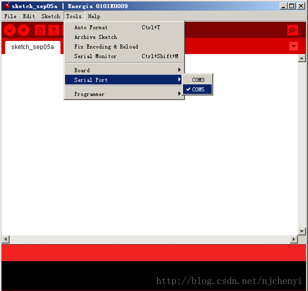 由此我们得知,MSP430 LAUNCHPAD使用的是串口5(串口号由你电脑给你的板子分配,不同电脑串口号可能不同,视实际情况而定),不过也没关系,Energia软件会在你插上板子的时候自动识别哪个串口号被使用了。我们点下COM5就会在前面打勾。如下图: