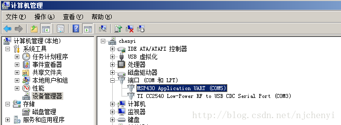 右击“计算机”->“管理”->“设备管理器”,(我是用的是Windows 7操作系统,所以是“计算机”。如果用的是Windows XP系统,则是“我的电脑”)查看“端口(COM 和 LPT)”,如下图:
