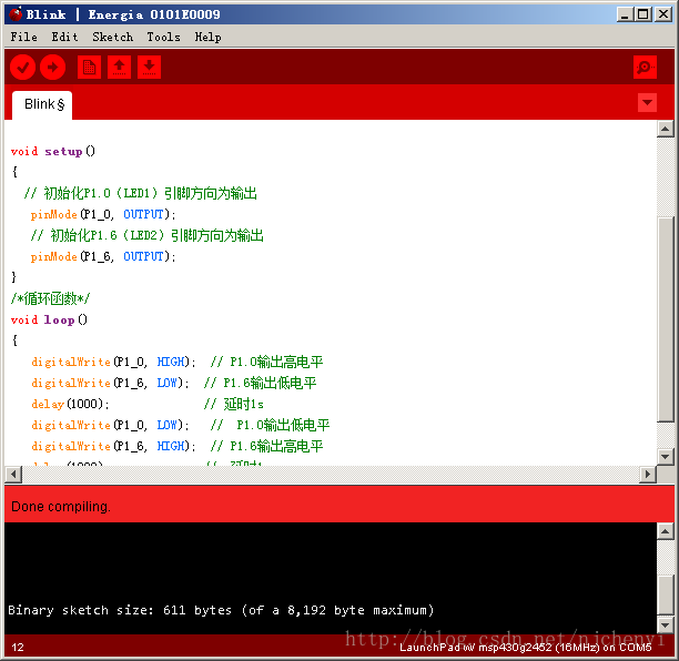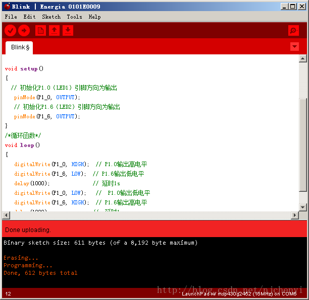 实验目的:让MSP430 LAUNCHPAD的P1.0和P1.6 交替闪烁