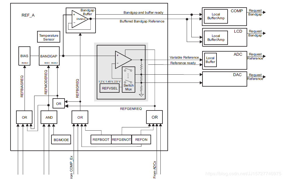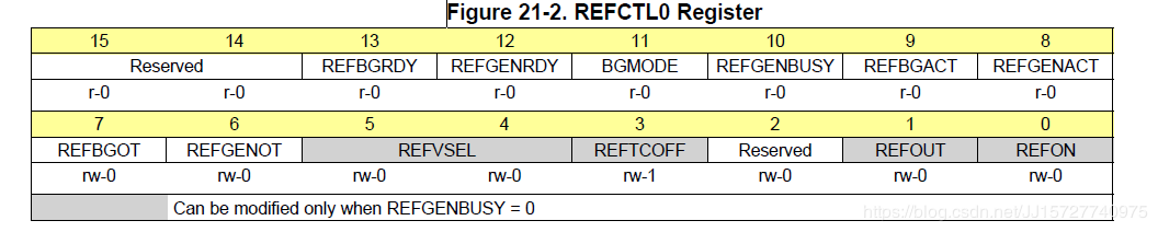 任何使用变量引用行的模拟模块都将在REFCTL0寄存器被置位。该位仅被读取,并指示REFGEN是活动的还是关闭的,当一个或多个模拟模块正在使用缓冲带隙时,REFBGACT是活动的参考线。这个位是只读的,并指示REFBG是活动的还是关闭的。当声明REFGENBUSY信号时,表明模拟模块正在使用引用和不能更改任何设置。例如,在活动ADC14转换期间,引用不应改变电压电平。当存在活动ADC14时断言REFGENBUSY转换。当它被断言时,REFGENBUSY写保护REFCTL0寄存器。这阻止了引用在任何活动转换期间被禁用或其级别发生更改。