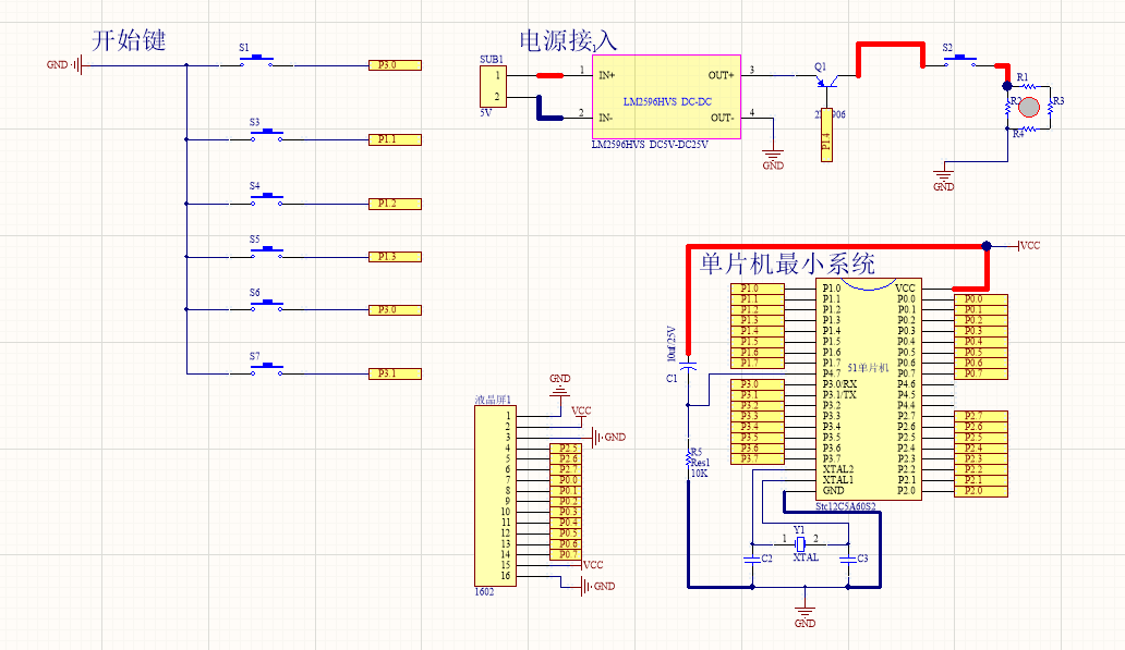 #include #include /*==================================== 自定义类型名 ====================================*/ typedef unsigned char INT8U; typedef unsigned char uchar; typedef unsigned int INT16U; typedef unsigned int uint; sbit PWM_1 = P1^4; //PWM1_Boost/Buck sbit enlarge = P3^0; //增大 sbit reduce = P3^1; //减小 /*==================================== 硬件接口位声明 ====================================*/ sbit IR = P3^2; //定义红外脉冲数据接口 外部中断O输入口 sbit beep = P2^3; //蜂鸣器的位置 sbit NPN1 = P1^1; //电机 低档 sbit NPN2 = P1^2; //电机 中档 sbit NPN3 = P1^3; //电机 高档 sbit NPNhuxi = P1^5; //电机 呼吸风 /************************************** 1602液晶 **************************************/ sbit RS = P2^5; sbit RW = P2^6; sbit E = P2^4; uchar IRtime; //检测红外高电平持续时间(脉宽) uchar IRcord[4]; //此数组用于储存分离出来的4个字节的数据(用户码2个字节+键值码2个字节) uchar IRdata[33]; //此数组用于储存红外的33位数据(第一位为引导码用户码16+键值码16) bit IRpro_ok, IRok; //第一个用于红外接收4个字节完毕。IRok用为检测脉宽完毕 void delay4(uchar t) { uint j; uchar i; for(i=0;i } //毫秒级延时 void delay(unsigned int z) { unsigned int x,y; for(x = z; x > 0; x--) for(y = 114; y > 0 ; y--); } void time0() interrupt 1 //定义定时器0 { IRtime++; //检测脉宽,1次为278us } void int0() interrupt 0 //定义外部中断0 { static uchar i; // 声明静态变量(在跳出函数后在回来执行的时候不会丢失数值)i用于把33次高电平的持续时间存入IRdata static bit startflag; //开始储存脉宽标志位 if(startflag) //开始接收脉宽检测 { if( (IRtime < 53) && (IRtime >= 32) ) /*判断是否是引导码,底电平9000us+高4500us 这个自己可以算我以11.0592来算了NEC协议的引导码低8000-10000+高4000-5000 如果已经接收了引导码那么i不会被置0就会开始依次存入脉宽*/ i = 0; //如果是引导码那么执行i=0把他存到IRdata的第一个位 IRdata[i] = IRtime; //以T0的溢出次数来计算脉宽,把这个时间存到数组里面到后面判断 IRtime = 0; //计数清零,下一个下降沿的时候在存入脉宽 i++; //计数脉宽存入的次数 if(i == 33) //如果存入34次 数组的下标是从0开始i等于33表示执行了34次 { IRok = 1; //那么表示脉宽检测完毕 i = 0; //把脉宽计数清零准备下次存入 } } else { IRtime = 0; //引导码开始进入把脉宽计数清零开始计数 startflag = 1; //开始处理标志位置1 } } void IRcordpro() //提取它的33次脉宽进行数据解码 { uchar i, j, k, cord, value; /*i用于处理4个字节,j用于处理一个字节中每一位,k用于33次脉宽中的哪一位 cord用于取出脉宽的时间判断是否符合1的脉宽时间*/ k = 1; //从第一位脉宽开始取,丢弃引导码脉宽 for(i = 0; i < 4; i++) { for(j = 0; j < 8; j++) { cord = IRdata[k]; //把脉宽存入cord if(cord > 5) //如果脉宽大于我11.0592的t0溢出率为约278us*5=1390那么判断为1 value = value | 0x80; /*接收的时候是先接收最低位, 把最低位先放到value的最高位在和0x08按位或一下 这样不会改变valua的其他位的数值只会让他最高位为1*/ if(j < 7) { value = value >> 1; //value位左移依次接收8位数据。 } k++; //每执行一次脉宽位加1 } IRcord[i] = value; //每处理完一个字节把它放入IRcord数组中。 value = 0; //清零value方便下次在存入数据 } IRpro_ok = 1; //接收完4个字节后IRpro ok置1表示红外解码完成 } void init_pwm() { CCON = 0; CL = 0; CH = 0; CMOD = 0X08; //0X08:43KHZ // 0X02,22KHZ // 0X0A,10KHZ // CCAPM1 =0x42;//8位PWM输出,无中断 CCAP1H=255;//占空比控制 CCAP1L=255; CR=1; } //呼吸风 /************************************** 短延时 **************************************/ void delay5ms() { uchar i,v,k; for(i=1;i>0;i--) for(v=168;v>0;v--) for(k=22;k>0;k--); } /************************************** 写指令 **************************************/ void lcd_Write_com(uchar com) { RS=0; //定义指令寄存器 RW=0; //写允许 P0=com; //写指令 delay5ms(); E=1; //片选端上拉 delay5ms(); E=0; //下降沿锁存 } /************************************** 写数据 **************************************/