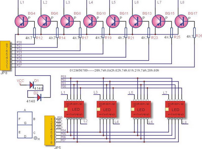 原理图:8个数码管它的数据线并联接到JP5, 位控制由8个PNP型三级管驱动后由JP8引出。