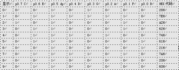 显示数字2则是C,F,H(小数点)不亮,同时由于接法为共阳接法,那么为0(低电平)是亮为1(高电平)是灭。从高往低排列,(p0.7_p0.0)写成二进制为01111110, 把他转化为16进制则为A2H。我们可以根据硬件的接线把数码管显示数字编制成一个表格, 以后直接调用就行了。