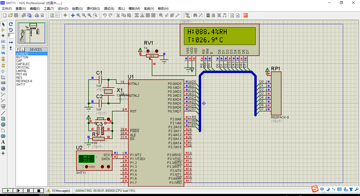 #include #include #include "LCD1602.h" /******************************************************** 宏定义 ********************************************************/ #define uint unsigned int #define uchar unsigned char #define noACK 0 #define ACK 1 #define STATUS_REG_W 0x06 #define STATUS_REG_R 0x07 #define MEASURE_TEMP 0x03 #define MEASURE_HUMI 0x05 #define RESET 0x1e enum { TEMP, HUMI }; typedef union //定义共用同类型 { unsigned int i; float f; } value; /******************************************************** 位定义 ********************************************************/ sbit SCK = P1 ^ 0; sbit DATA = P1 ^ 1; /******************************************************** 变量定义 ********************************************************/ uchar wendu[6]; uchar shidu[6]; /******************************************************** 50us延时函数 ********************************************************/ void delay_50us(uint t) { uint j; for (; t>0; t--) for (j = 19; j>0; j--); } /******************************************************* 液晶显示函数 ********************************************************/ void displaywendu(void) { uchar i; write_com(0x80+0x40); write_data('T'); write_data(':'); for (i = 0; i<3; i++) { write_data(wendu[i]); delay_50us(1); } for (i = 0; i<1; i++) { write_data('.'); delay_50us(1); } for (i = 4; i<5; i++) { write_data(wendu[i]); delay_50us(1); } write_data(0xDF); write_data('C'); } /******************************************************** 液晶显示函数 ********************************************************/ void displayshidu(void) { uchar i; write_com(0x80); write_data('H'); write_data(':'); for (i = 0; i<3; i++) { write_data(shidu[i]); delay_50us(1); } for (i = 0; i<1; i++) { write_data('.'); delay_50us(1); } for (i = 4; i<5; i++) { write_data(shidu[i]); delay_50us(1); } write_data('%'); write_data('R'); write_data('H'); } /******************************************************** SHT11写字节程序 ********************************************************/ char s_write_byte(unsigned char value) { unsigned char i, error = 0; for (i = 0x80; i>0; i >>= 1) //高位为1,循环右移 { if (i&value) DATA = 1; //和要发送的数相与,结果为发送的位 else DATA = 0; SCK = 1; _nop_(); _nop_(); _nop_(); //延时3us SCK = 0; } DATA = 1; //释放数据线 SCK = 1; error = DATA; //检查应答信号,确认通讯正常 _nop_(); _nop_(); _nop_(); SCK = 0; DATA = 1; return error; //error=1 通讯错误 } /******************************************************** SHT11读字节程序 ********************************************************/ char s_read_byte(unsigned char ack) { unsigned char i, val = 0; DATA = 1; //释放数据线 for (i = 0x80; i>0; i >>= 1) //高位为1,循环右移 { SCK = 1; if (DATA) val = (val | i); //读一位数据线的值 SCK = 0; } DATA = !ack; //如果是校验,读取完后结束通讯; SCK = 1; _nop_(); _nop_(); _nop_(); //延时3us SCK = 0; _nop_(); _nop_(); _nop_(); DATA = 1; //释放数据线 return val; } /******************************************************** SHT11启动传输 ********************************************************/ void s_transstart(void) { DATA = 1; SCK = 0; //准备 _nop_(); SCK = 1; _nop_(); DATA = 0; _nop_(); SCK = 0; _nop_(); _nop_(); _nop_(); SCK = 1; _nop_(); DATA = 1; _nop_(); SCK = 0; } /******************************************************** SHT11连接复位 ********************************************************/ void s_connectionreset(void) { unsigned char i; DATA = 1; SCK = 0; //准备 for (i = 0; i<9; i++) //DATA保持高,SCK时钟触发9次,发送启动传输,通迅即复位 { SCK = 1; SCK = 0; } s_transstart(); //启动传输 } /******************************************************** SHT11温湿度检测 ********************************************************/ char s_measure(unsigned char *p_value, unsigned char *p_checksum, unsigned char mode) { unsigned error = 0; unsigned int i; s_transstart(); //启动传输 switch (mode) //选择发送命令 { case TEMP: error += s_write_byte(MEASURE_TEMP); break; //测量温度 case HUMI: error += s_write_byte(MEASURE_HUMI); break; //测量湿度 default: break; } for (i = 0; i<65535; i++) if (DATA == 0) break; //等待测量结束 if (DATA) error += 1; // 如果长时间数据线没有拉低,说明测量错误 *(p_value) = s_read_byte(ACK); //读第一个字节,高字节 (MSB) *(p_value + 1) = s_read_byte(ACK); //读第二个字节,低字节 (LSB) *p_checksum = s_read_byte(noACK); //read CRC校验码 return error; // error=1 通讯错误 } /********************************************************