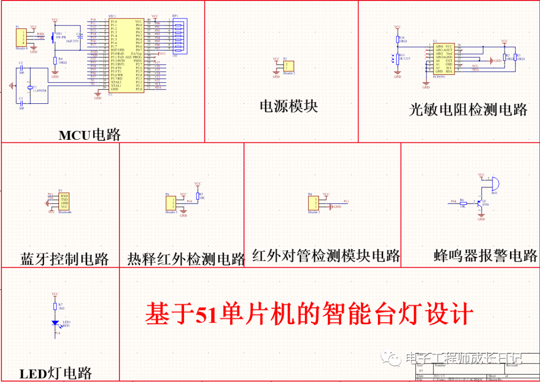 系统由单片机最小系统+光敏电阻及AD模块+蓝牙模块+红外模块+LED灯+蜂鸣器+电源构成