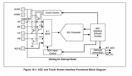 Linux-2.6.32.2 内核并没有提供支持 S3C2440 的 ADC 驱动程序,因此我们自行设计了一个,这个驱动比较简单,属于字符设备,。在 S3C2440 芯片中,AD 输入和触摸屏接口使用共同的 A/D 转换器,见S3C2440芯片手册第 16 章节,如图。