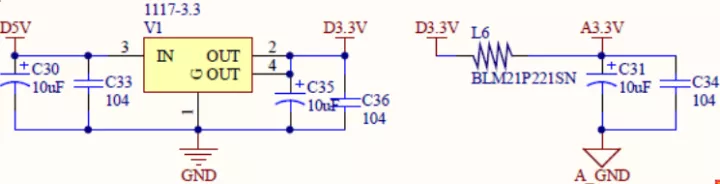3.3V稳压电路:我们通过输入5V电压到1117,通过1117转化成3.3V电压输出。