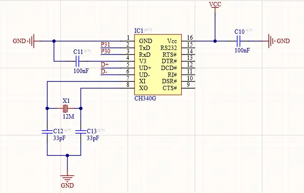 下载电路:CH340是一个USB总线的转接芯片,实现USB转串口、USB转IrDA红外或者USB转打印口。