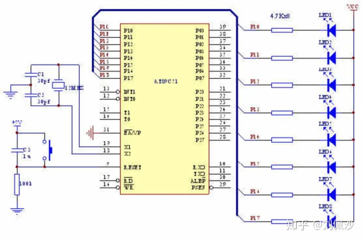 从原理图中可以看出,如果要让接在P1.0口的LED1亮起来,那么只要把P1.0口的电平变为低电平就可以了;相反, 如果要接在P1.0口的LED1熄灭,就要把P1.0口的电平变为高电平;同理,接在P1.1~P1.7口的其他7个LED的点亮和熄灭的方法同LED1。因此,要实现流水灯功能,我们只要将发光二极管LED1~LED8依次点亮、熄灭,8只LED灯便会一亮一暗的做流水灯了。在此我们还应注意一点,由于人眼的视觉暂留效应以及单片机执行每条指令的时间很短,我们在控制二极管亮灭的时候应该延时一段时间,否则我们就看不到“流水”效果了。