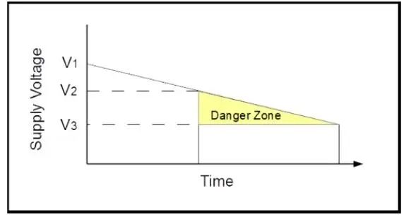 当电源关闭时,电压不会一直下降。相反,其他电源将电源电压保持在危险区域。这种电压的另外一种叫法是“虚假电量”。目前,没有BOR可以检测到这种情况并引起复位。再次打开电源时,设备可能无法正常上电,因为可能不会触发上电复位电路。由于电源电压低于最小值并且没有复位,因此后续操作不确定。
