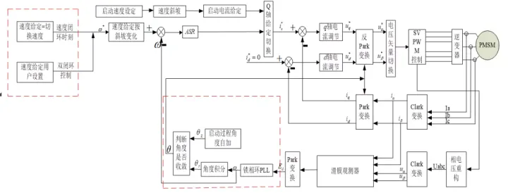 针对上面分析的,PMSM的滑膜观测器额无感FOC控制框图如下:
