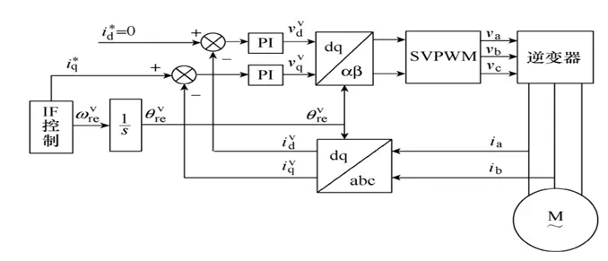 I/F启动方式的基本思想是在电枢绕组中产生幅值跟随参考值、频率逐渐增大的旋转电流矢量,使转子加速起动。它的特点是工作在速度开环、电流闭环的状态,定子绕组电流经过坐标变换以后,投影到由指令位置角决定的旋转坐标系上,并受期望值的约束,可有效避免过流产生。其控制框图如下图7所示。