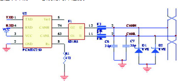 CAN收发器与CAN总线的接口如图2所示,其中SJA1000的TX0,RX0分别与CAN收发器的TXD,RXD相连,为提高CAN收发器82C250与CAN总线的接口部分的抗干扰能力,特在82C250 的CANH 和CANL 引脚串接一个共模扼流圈,以消除一定的共模干扰,而使得总线差分信号能够顺利通过。并且CANH和CANL分别通过一个磁珠与总线相连,以起到消除一定的高频干扰。同时CANH 和CANL与地之间并联了两个30pf 的小电容,可以起到滤除总线上的高频干扰和一定的防电磁辐射的能力。另外在两根CAN总线接入端与地之间分别接了一个TVS,当CAN 总线有较高的电压时通过TVS的击穿而接地,可起到一定的过压保护作用。82C250 的Rs引脚上接有一个斜率电阻以降低CAN总线的向外辐射。