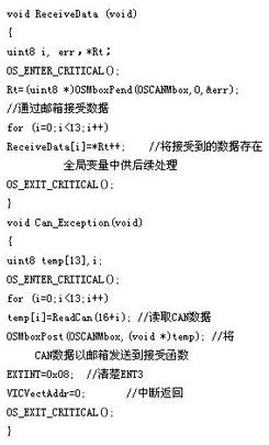 根据电路图1,采用中断接受的方式来接受数据,LPC2131的P0.30设置为外部中断3,整个数据接受模块由数据接受函数void ReceiveData(uint8 *Rt)、中断处理函数CAN_Exception(void)构成。当SJA1000接受到CAN总线数据,通过接收中断使得LPC2131产生外部中断3而使其进入中断处理函数,进而对接受到的数据进行处理。其中数据接受函数和中断处理函数如下: