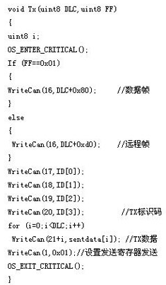 假设要发送的数据的ID存储在数组ID中,数据存储在数组SendData中,其发送模块程序如下所示,其中参数DLC为发送的字节数,FF为帧类型,即0为数据帧,1为远程帧。