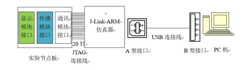 直流电机实验环境由PC机(安装有Windows XP操作系统、ADS1.2集成开发环境和J-Link-ARM-V410i仿真器)、J-Link-ARM仿真器、NXP LPC2378实验节点板、直流电机实验模块和LCD显示实验模块组成,如图3.4.1所示。