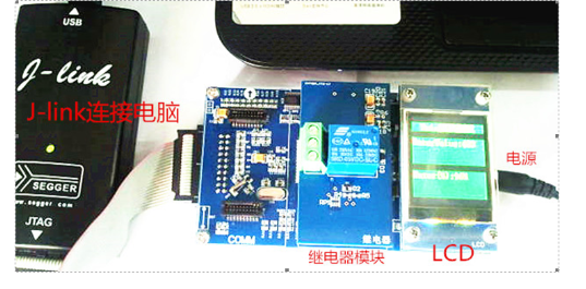 将继电器传感器模块安装到开发板上(断电安装),然后用J-LINK仿真器的一端用USB接口与电脑相连,一端的20Pin的JTAG引脚与NXP LPC2378节点板的J2相连,并给NXP LPC2378节点板上电,如下图所示: