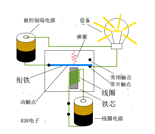 继电器就是线圈控制的开关。开关有2-3个接线端。如图3.4.3所示继电器,当AC之间没有5V,线圈没电,这时,B和E通,B和D不通。