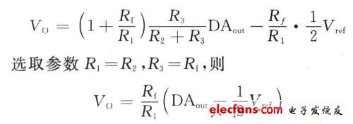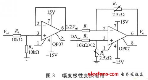 幅度极性变换电路要用到(1/2)Vref,所以要由基准电压源分压得到。为了防止电压被拉低,增加一个电压跟随电路,如图3左半部分所示。其中,参数选择R8=R9=10 kΩ,运放使用OP07。