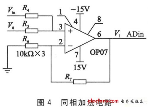 同相加法电路如图4所示。参数选择R4=R5=1ckΩ,R6=R7=10 kΩ,所以V1=Vin+V0,其中Vin为输入电压,V0为阶梯波电压,V1输入到ARM内部处理。