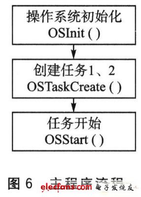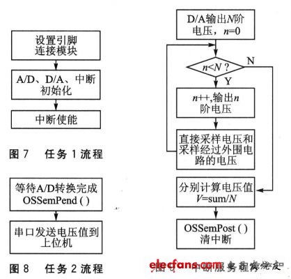 程序主要由以下几部分组成:主程序,负责初始化操作系统和创建任务;任务1,负责初始化目标板;任务2,负责目标板与上位机的串口通信;中断服务程序,负责采样和计算电压。各部分流程如图6~图9所示。