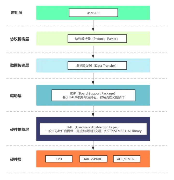 • 硬件层描述的是运算器件和逻辑器件,如CPU、ADC、TIMER、各类IC等,是所有软件组件的硬件基础,是软件逻辑的最终底层实现。