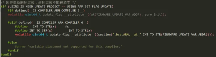volatile uint64_t update_flag __attribute__((section(".bss.ARM.__at_" INT_TO_STR(FIRMWARE_UPDATE_VAR_ADDR))));
