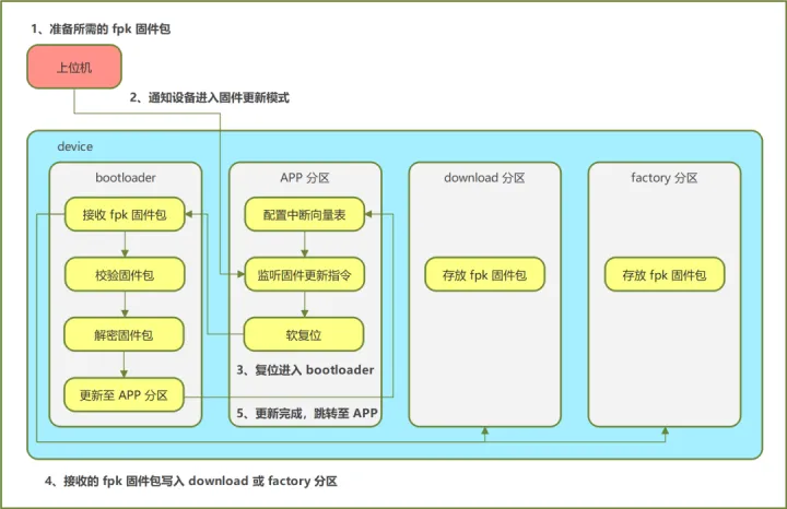 根据配置的分区方案不同,固件的更新流程会有些不同,此处仅展示简要的更新流程,便于快速理解固件更新的流程,因此屏蔽了很多细节,更详细的内容,请阅读《bootloader程序设计思路》文档和源代码。