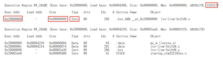 2. 若选择了“使用标志位作为固件更新的依据 USING_APP_SET_FLAG_UPDATE ”(否则忽略此步骤),编译通过后,查看 map 文件是否新增了一个 Region ,并且地址正确, Type 为 Zero ,该区域为 UNINIT ,若全部符合,则移植成功。