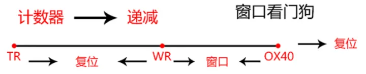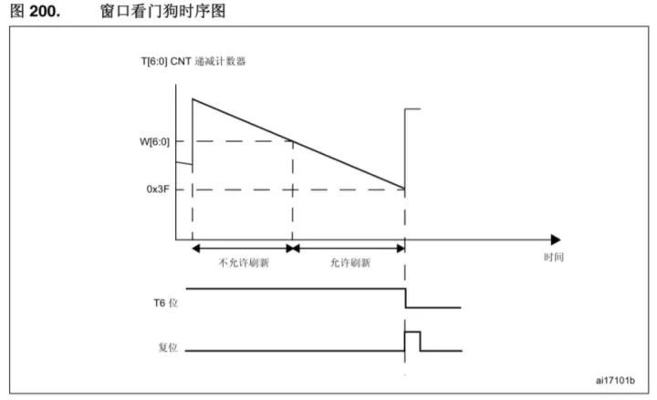 在递减计数器达到窗口配置寄存器(WWDG->CFR)数值之前,如果 7 位的递减计数器数值(在控制寄存器中)被刷新,那么也将产生一个 MCU 复位。这表明递减计数器需要在一个有限的时间窗口中被刷新。