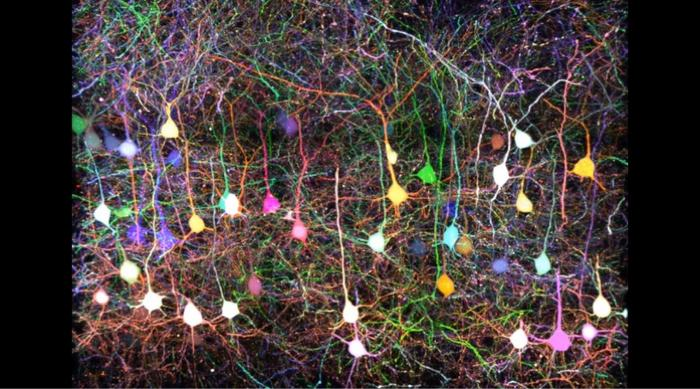 小鼠皮层2/3锥体神经元用7色TETBOW标记。图片来源:今井武/九州大学