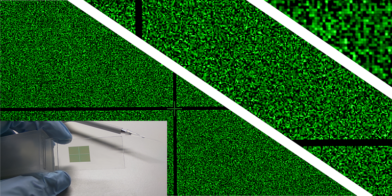 全尺寸高密度RNA微芯片大小与指甲盖相当,可容纳多达780000个独特的RNA序列,每个序列占据约14 x14μm²的面积。可通过添加带有绿色荧光标签的互补DNA链来验证RNA的存在和质量。图片来源:塔迪卡·凯基奇/美国科学促进会优瑞科网站