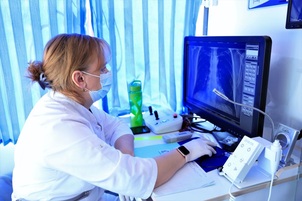 2021年4月23日,在哈萨克斯坦图尔根村,医疗人员在医疗车内观看患者的胸透照片。(新华社发)