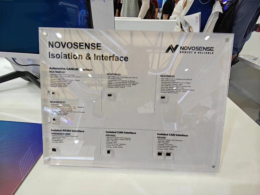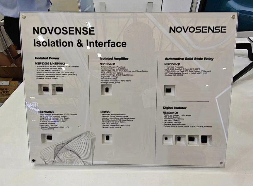 其次,在工业产品方面,纳芯微展出了可用于工业电机驱动系统过压和过温保护的隔离式比较器NSI22C1x系列、集成隔离电源、数字隔离器、通信接口的三合一产品NSIP8308x和NSIP1042。