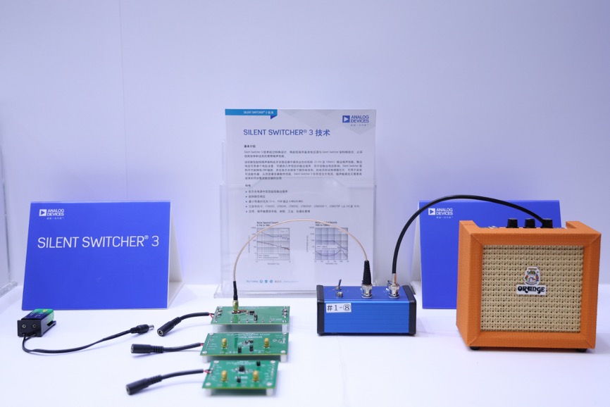 此次ADI展台展示经过特殊设计的Silent Switcher 3将超低噪声基准电压源与Silent Switcher架构相结合,实现高效率和出色的宽带噪声性能,在开关稳压器中提供出色的低频(0.1Hz至100kHz)输出噪声性能,非常适合噪声敏感信号链、射频、工业、仪器仪表等领域应用。现场演示中,Silent Switcher 3的噪声抑制效果明显,听感上能明显感受到区别。
