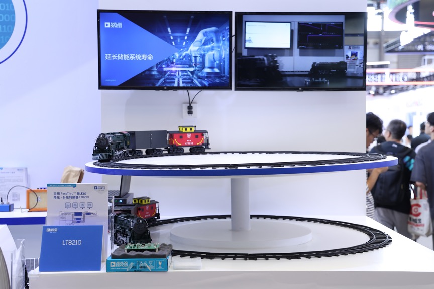 此次ADI展台展示使用PassThru技术的LT8210,其系统运行时间比传统控制器长46%。作为可应用于汽车、工业、电信、航空电子系统的降压升压转换器,LT8210能够在直通、强制连续、脉冲跳跃和突发模式Burst模式下工作。特别是当输入电压在用户可编程窗口内时,直通功能直接将输入传递到输出端,可消除开关损耗和EMI,同时较大限度地提高效率。现场演习中,ADI使用城市火车模型生动形象生动形象地对比了传统降压-升压转换器和LT8210的区别,前者火车运行时长明显低于后者。