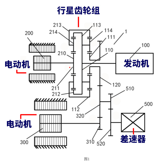 通过专利图来看,该系统以一台发动机搭配双电机的配置,通过精心设计的两组行星齿轮实现动力传递,巧妙地省去了传统离合器,从而提升了整体的连接强度与效率。