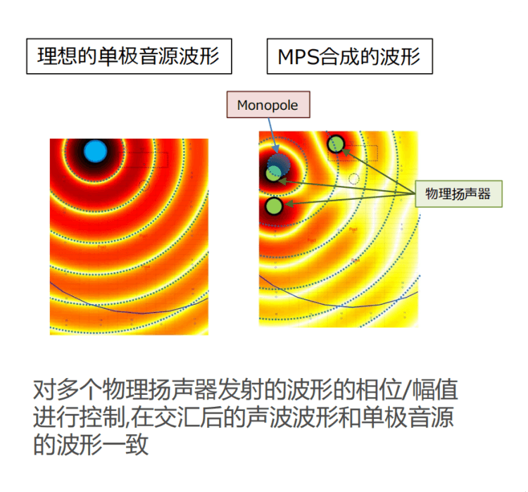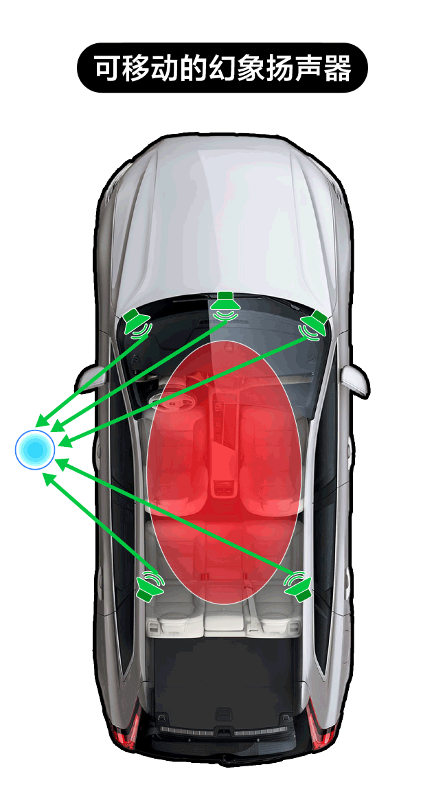 可以看到MPS技术合成幻象扬声器可以设定在车内外的不同位置,同时可以实时移动,所有扬声器参与声场的合成,拥有稳定、大范围的“甜点”等优点。
