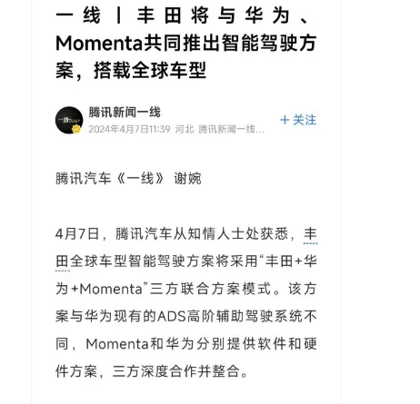 近日,有媒体报道称,丰田全球车型智能驾驶方案将采用“丰田+华为+Momenta”三方联合方案模式。其中,Momenta负责智驾相关的软件,而华为负责硬件解决方案。对于华为来说,如果后期项目顺利落地,那无疑是一个重大的突破。虽然丰田并没有整个引入华为ADS 2.0智驾方案,但是一旦华为给丰田智驾系统提供芯片,这也足以被视为一个里程碑意义的事件。