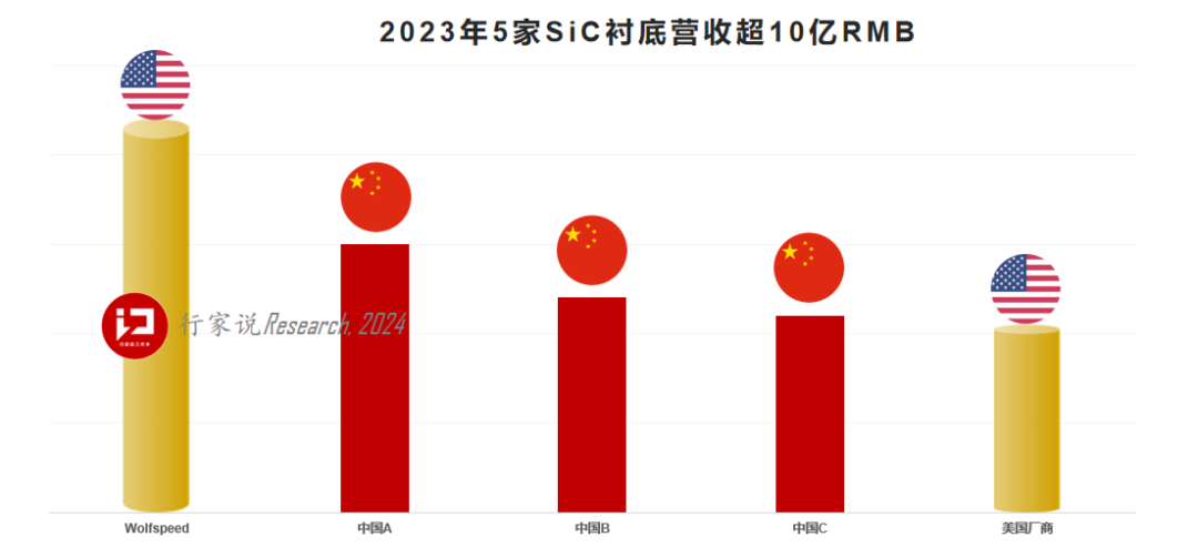 但是到了2023年,国产导电型衬底的销量和市占率大幅飙升。据“行家说三代半”调研,2023年全球有5家企业的导电型碳化硅衬底营收超过了10亿元人民币,领头羊依旧是Wolfspeed,但2-4名都是中国企业。