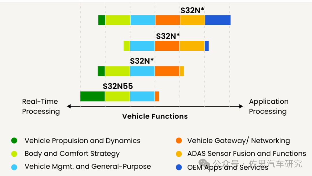5纳米的S32N55是S32N系列的首款产品,将来还有三款产品,这个系列应该至少都是5纳米制造工艺,不排除有3纳米制造工艺。图上可以看出S32N55主要面对底盘、车身和网关领域的应用。