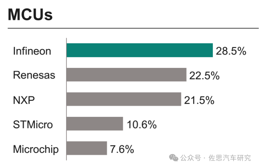 汽车MCU领域,英飞凌增长迅速,2020年还是全球第四,市场占有率不到10%,2024年已经成为全球第一,原本并列第一的瑞萨和NXP市场占有率快速下降,下降最快的则是德州仪器,从第三跌至第六。前五厂家市场占有率超过90%,国产汽车MCU的市场占有率估计不到2%。